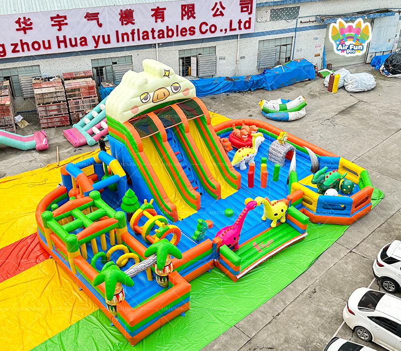 Our structures are made of commercial-grade PVC fabric (0.45mm/0.55mm thickness) with anti-tear coating and non-slip surfaces. All products comply with ASTM F24 amusement safety standards and undergo weekly pressure tests to ensure stability in winds up to 25 mph.