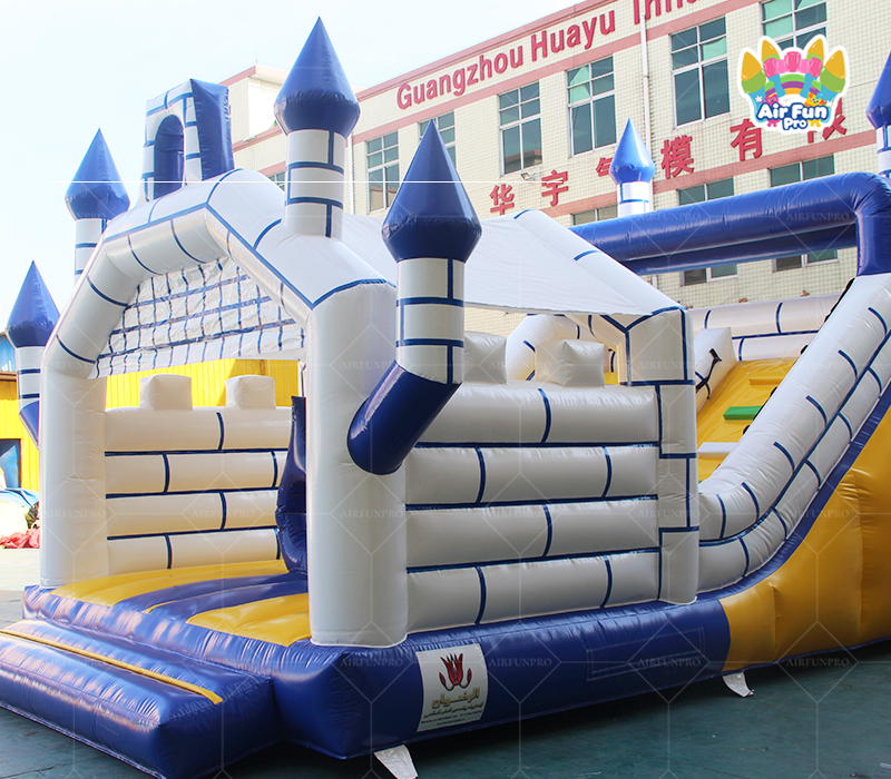 AIRFUNPRO's castle-themed inflatable trampoline perfectly blends imagination and craftsmanship for an extraordinary experience. This well-designed trampoline features a vibrant blue, white, and yellow color scheme, offering unparalleled fun and safety, transforming any space into a royal playground full of endless adventure. Whether it's a backyard party or a community event, our trampoline creates unforgettable memories.