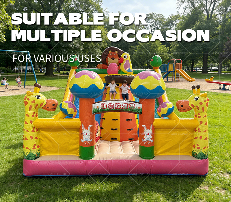 This is a charming jungle animal-themed inflatable slide and trampoline combo, designed specifically for toddlers. It features a 3D giraffe sculpture, brightly colored mushroom decorations, and lively cartoon animal patterns in bright yellow, pink, and blue tones. Its low-profile, soft design combines a smooth slide and a spacious trampoline area, providing a safe and age-appropriate play experience for young children.