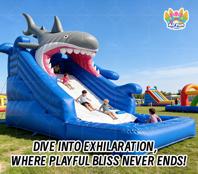This is a thrilling shark-themed inflatable water slide featuring a 3D great white shark head archway, dynamic wave details, and a refreshing blue color scheme. Its compact 4m x 2.9m x 5m (13.12ft x 9.51ft x 16.4ft) size is designed for smaller venues, offering a fast and smooth sliding experience culminating in a cool splash pool, ideal for private, ocean-themed fun.