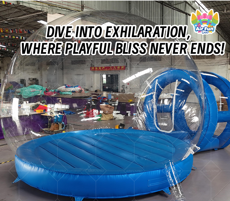 This Christmas-exclusive transparent inflatable snow globe pod takes a fully transparent pod as the carrier, printed with Christmas elements like Christmas trees and holiday gift boxes, and can be customized with brand-exclusive logos. It is paired with an exclusive connecting hatch and a built-in inflatable platform—the transparent pod amplifies the festive visual immersion, the connecting hatch allows easy access, and the inflatable platform provides a comfortable interactive space. Made with 0.55mm PVC material and high-temperature heat-sealing technology, it has seamless, airtight seams, fitting scenarios like Christmas celebrations, mall holiday installations, and brand-themed events—serving as an eye-catching check-in spot in the holiday season and a warm interactive space for parents, kids and visitors, infusing Christmas atmosphere with fun and warmth.